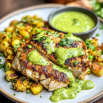 Transfer the chicken onto plates alongside a generous helping of rice. Drizzle your zesty green sauce over both for an unforgettable finishing touch.